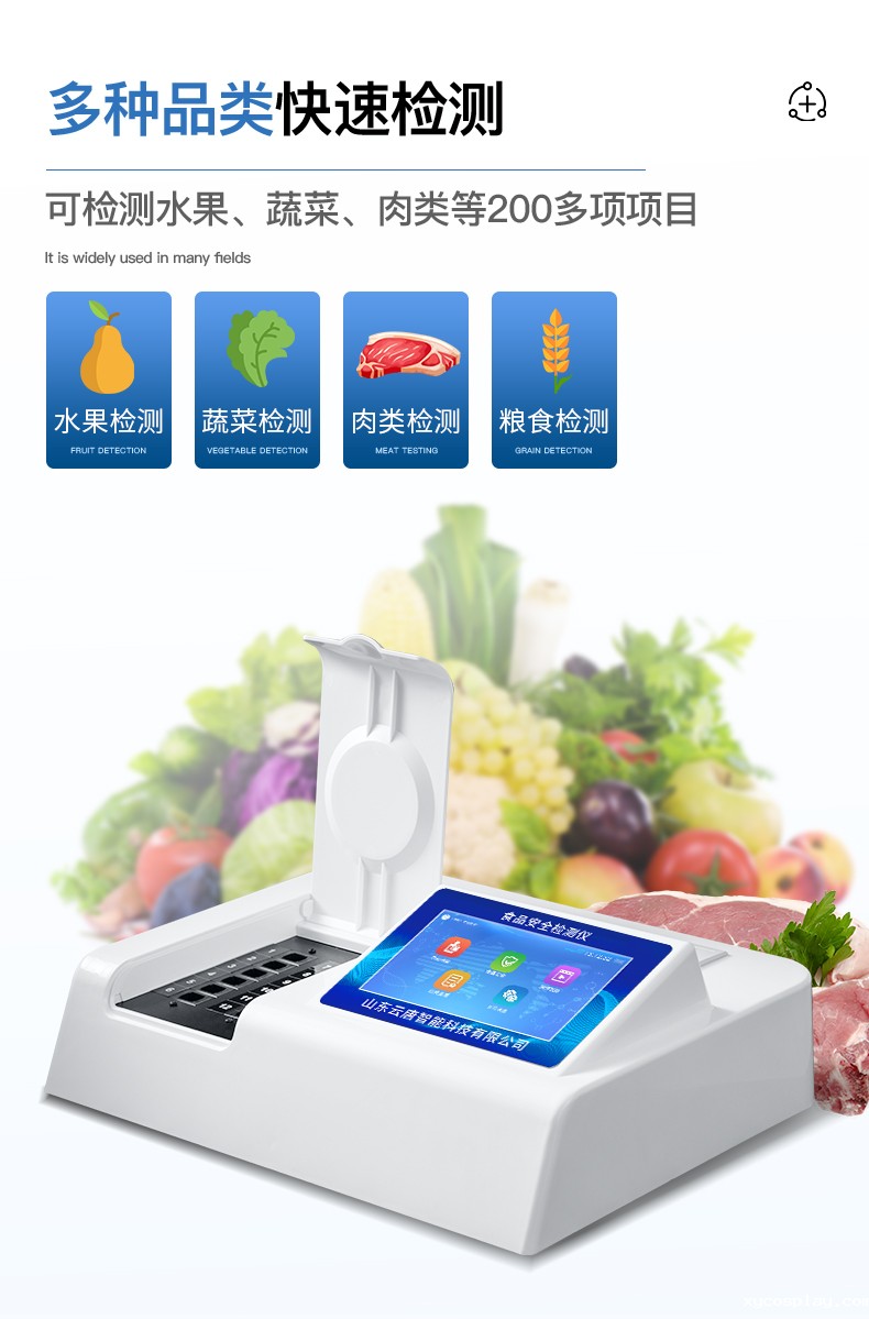 可快速检测各类食品中的甲醛、二氧化硫、亚硝酸盐、吊白块的含量,仪器预留其他项目检测程序和端口,根据日后需求可方便的自主增加检测项目。