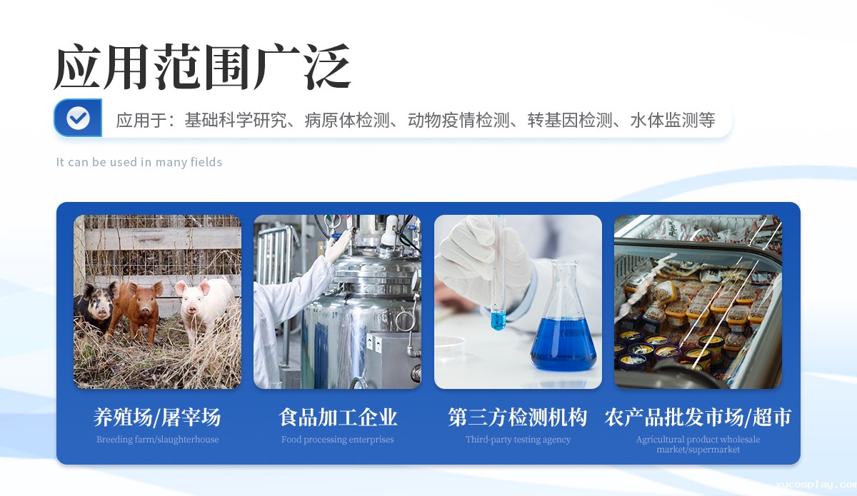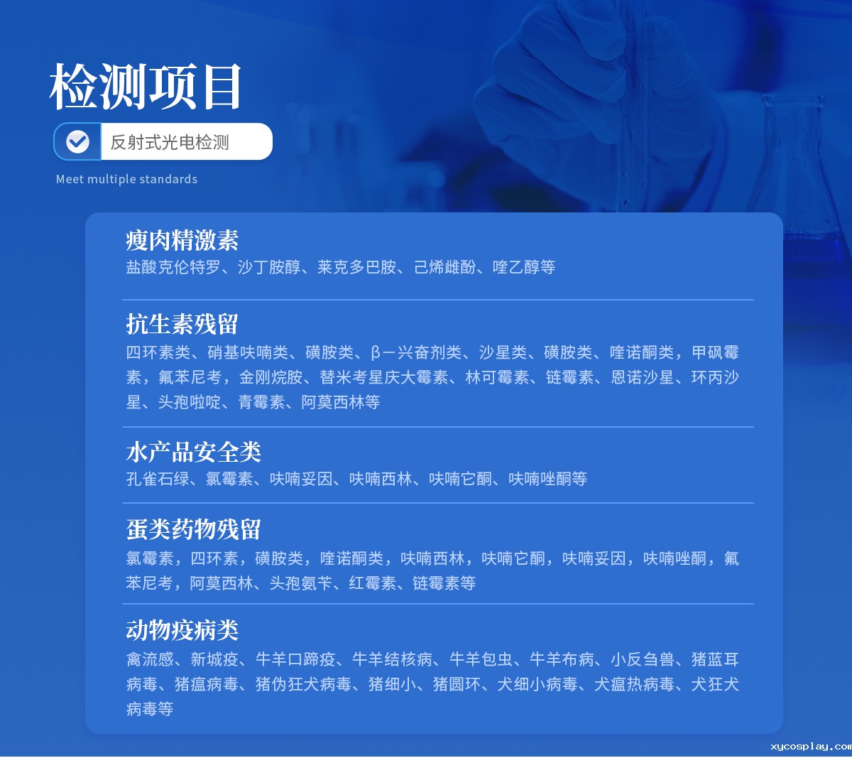 | 瘦肉精激素:盐酸克伦特罗、沙丁胺醇、莱克多巴胺、己烯雌酚、喹乙醇等 | 抗生素残留:四环素类、硝基呋喃类、磺胺类、β-兴奋剂类、沙星类、磺胺类、喹诺酮类,甲砜霉素,氟苯尼考,金刚烷胺、替米考星、庆大霉素、林可霉素、链霉素、恩诺沙星、环丙沙星、头孢啦啶、青霉素、阿莫西林等 | 水产品安全类:孔雀石绿、氯霉素、呋喃妥因、呋喃西林、呋喃它酮、呋喃唑酮等 | 蛋类药物残留 氯霉素,四环素,磺胺类,喹诺酮类,呋喃西林,呋喃它酮,呋喃妥因,呋喃唑酮,氟苯尼考,阿莫西林、头孢氨苄、红霉素、链霉素等 | 动物疫病类:禽流感、新城疫、牛羊口蹄疫、牛羊结核病、牛羊包虫、牛羊布病、小反刍兽、猪蓝耳病毒、猪瘟病毒、猪伪狂犬病毒、猪细小、猪圆环、犬细小病毒、犬瘟热病毒、犬狂犬病毒等 |