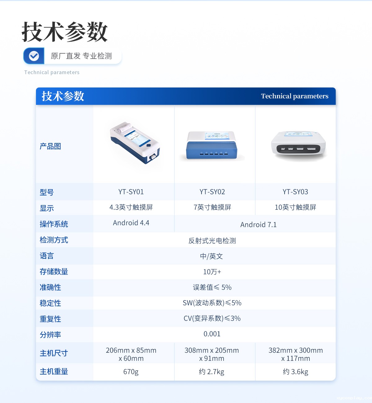 | 1、 10.1英寸电容式触摸屏,分辨率:1280:x:800,内部存储:1+8GB | 2、 操作系统:Android:7.1 | 3、 检测方式:反射式光电检测 | 4、 语言:中/英文: | 5、 存储数量:10万+ | 6、 准确性:误差值≤:5% | 7、 稳定性:SW(波动系数)≤5% | 8、 重复性:CV(变异系数)≤3% | 9、 分辨率:0.001 | 10、★通道:1个单卡卡槽(70mm*20mm*5.6mm);1个二联卡卡槽(70mm*28mm*5.6mm);1个三联卡卡槽(70mm*40mm*5.6mm);1个四联卡卡槽(70mm*50mm*5.6mm) | 11、检测时间:<:5秒:(单卡及多联卡);可对样本进行胶体金定性/半定量检测。 | 12、打印机:热敏打印机(热敏打印纸:57*30mm) | 13、数据传输:WiFi、蓝牙、USB、射频读卡、外置扫码模块(选配) | 14、数据处理:可通过通讯端口进行数据汇总、上传监管平台等 | 15、检测通道孵育检测一体,温度范围::室温:+5℃:~:60℃ | 16、接口:USB接口:2个;USB-B接口:1个;LAN接口:1个:;DC电源接口:5.5/2.1mm | 17、电源:输入:AC:220V:±:20V,:50Hz:±:1Hz;输出:DC:12V,:5A | 18、使用环境:温度:0~50℃;湿度:0~90%: | 19、主机尺寸::382mm:x:300mm:x:117mm | 20、主机重量:约:3.6kg |