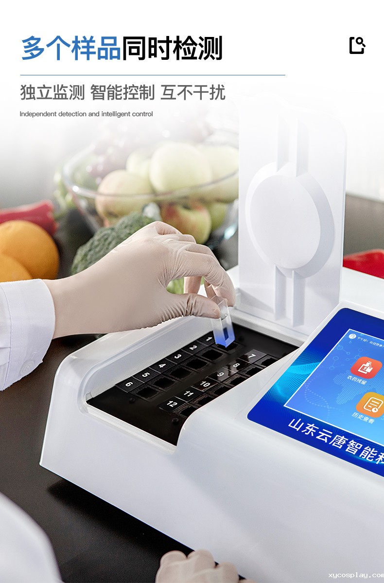 安卓智能操作系统,采用更加**和人性化操作,仪器具有网线连接、wifi联网上传、GPRS无线远传功能,快速上传数据。智能化程度高,仪器具有自检功能:具有开机自检和调零功能,具有自动检测重复性功能。检测通道:≥12个检测通道,可以同时测试多个样品,每个样品由程序控制分别独立工作,不会互相干扰。显示方式:≥8英寸液晶触摸屏显示,人性化中文操作界面,读数直观、简单。配备新一代嵌入式热敏打印机,可选择手动打印或者自动打印,检测完成可自动打印检测报告和二维码。光源采用进口超高亮发光二极管,高精度、稳定性强、光源可控、可以关掉不使用的光源,功耗更低。采用USB2.0接口设计,方便数据的存贮和移动,并可随时与计算机直接相连,并且可用计算机控制仪器。实现数据查询、浏览、分析、统计、打印等。仪器带有监管平台。数据可局域网和互联网数据上传,检测结果直接传至食品安全监管平台。进行区域食品安全监管及大数据分析处理,检测区域食品安全长短期动态,达到食品安全问题预估、预警一体化便携式快检设备,满足现场及流动检测使用需求,能够在同一软件下实现所有检测项目的检测,并可通过同一窗口直观显示检测结果。仪器具有多品类多种类样品菜单库,可灵活选择检测样品,不同的检测通道可同时检测不同的样品项目。也可在仪器上直接编辑录入样品名称、检测指标、送检单位等信息并保存进样品数据库。样品处理简单省力,整体操作快速、安全、便捷。仪器具有自身保护功能,可设置用户名及密码,防止非工作人员操作等。高灵敏度,高检测精度,高重复性精度,扫描式高精度光学传感器。内置强大的数据库,可在仪器上直接选择样品名称、检测指标、送检单位等信息,也可在仪器上直接编辑录入样品名称、检测指标、送检单位等信息并保存进样品数据库。仪器具有重新校准、锁定、恢复出厂设置功能。支持U盘存储。 结果判定线可修改,对照值标定值可保存,断电不丢失数据。