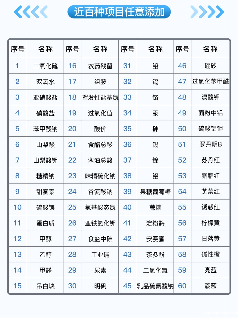 可快速检测各类食品中的甲醛、二氧化硫、亚硝酸盐、吊白块的含量,仪器预留其他项目检测程序和端口,根据日后需求可方便的自主增加检测项目。