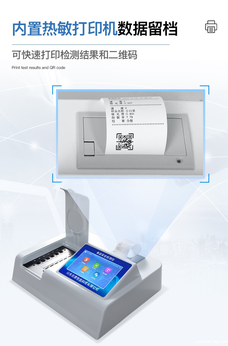 | 安卓智能操作系统,采用更加**和人性化操作,仪器具有网线连接、wifi联网上传、GPRS无线远传功能,快速上传数据。 | 智能化程度高,仪器具有自检功能:具有开机自检和调零功能,具有自动检测重复性功能。 | 检测通道:≥12个检测通道,可以同时测试多个样品,每个样品由程序控制分别独立工作,不会互相干扰。 | 显示方式:≥8英寸液晶触摸屏显示,人性化中文操作界面,读数直观、简单。 | 配备新一代嵌入式热敏打印机,可选择手动打印或者自动打印,检测完成可自动打印检测报告和二维码。 | 光源采用进口超高亮发光二极管,高精度、稳定性强、光源可控、可以关掉不使用的光源,功耗更低。 | 采用USB2.0接口设计,方便数据的存贮和移动,并可随时与计算机直接相连,并且可用计算机控制仪器。实现数据查询、浏览、分析、统计、打印等。 | 仪器带有监管平台。数据可局域网和互联网数据上传,检测结果直接传至食品安全监管平台。进行区域食品安全监管及大数据分析处理,检测区域食品安全长短期动态,达到食品安全问题预估、预警 | 一体化便携式快检设备,满足现场及流动检测使用需求,能够在同一软件下实现所有检测项目的检测,并可通过同一窗口直观显示检测结果。 | 仪器具有多品类多种类样品菜单库,可灵活选择检测样品,不同的检测通道可同时检测不同的样品项目。也可在仪器上直接编辑录入样品名称、检测指标、送检单位等信息并保存进样品数据库。 | 样品处理简单省力,整体操作快速、安全、便捷。 | 仪器具有自身保护功能,可设置用户名及密码,防止非工作人员操作等。 | 高灵敏度,高检测精度,高重复性精度,扫描式高精度光学传感器。 | 内置强大的数据库,可在仪器上直接选择样品名称、检测指标、送检单位等信息,也可在仪器上直接编辑录入样品名称、检测指标、送检单位等信息并保存进样品数据库。 | 仪器具有重新校准、锁定、恢复出厂设置功能。 | 支持U盘存储。 结果判定线可修改,对照值标定值可保存,断电不丢失数据。 |