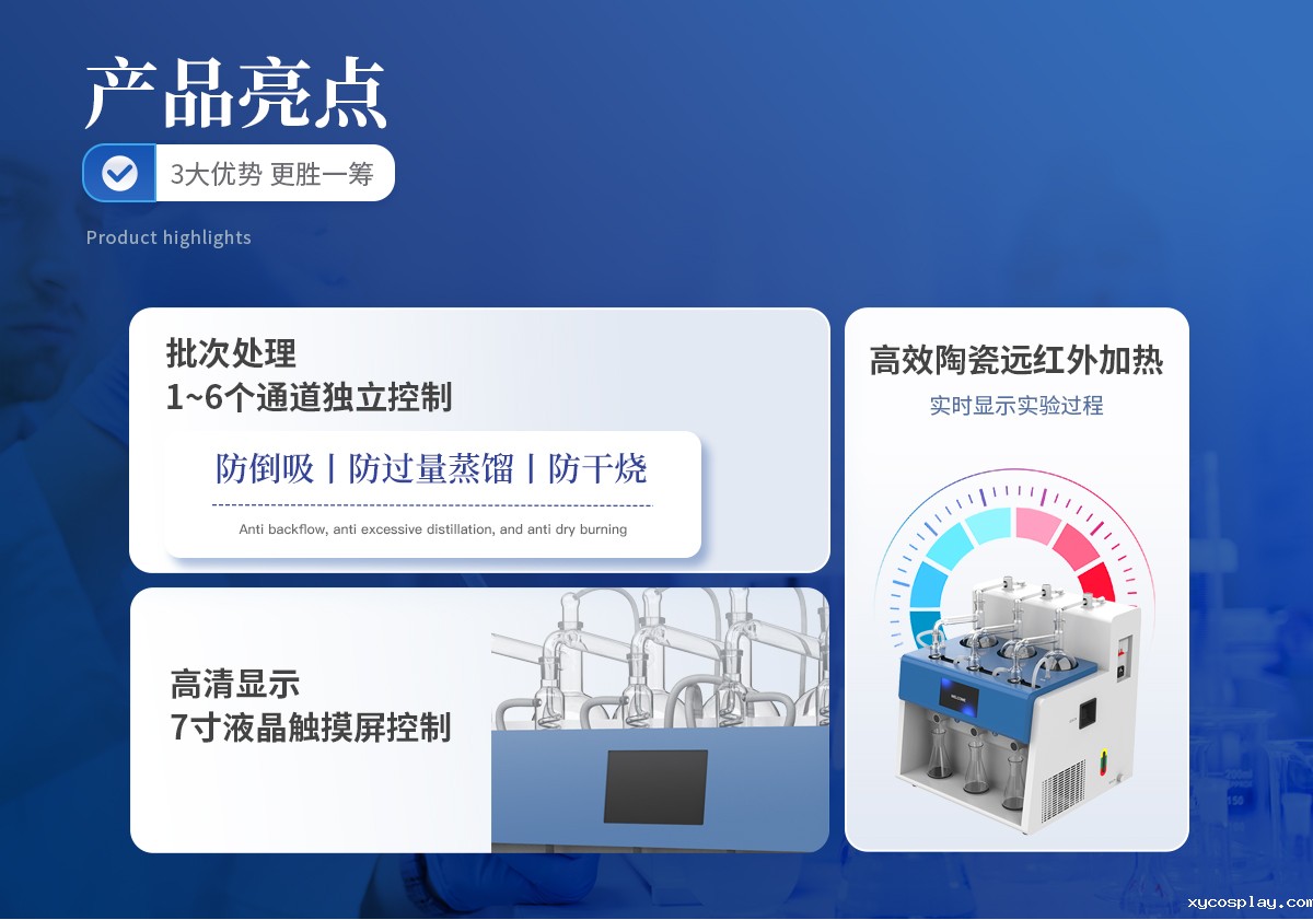 | 1、批次处理量为1~6个,每个通道均独立控制,并且每个通道都配备了防倒吸、防过量蒸馏及防干烧的功能保护设计; | 2、采用7寸液晶触摸屏控制,蒸馏方法可设置,自动保存,下次开机可直接使用;系统自带校正蒸馏体积(重量)功能。 | 3、加热模块采用远红外陶瓷辐射加热方式,碗状加热热源设计,确保样品容器(圆底烧瓶)与热源密切贴合,加热功率调节范围广、加热均匀性好、热辐射效率高,蒸馏速度快、使用寿命长。 | 4、采用系统可设置蒸馏量、蒸馏时间;实时显示运行状态、蒸馏量及剩余蒸馏时间。各蒸馏单元可单孔定时定量设置,独立控制,单独运行,蒸馏结束自动停止。 | 5、蒸馏终点控制采用时间和重量双重模式,蒸馏结果到达重量或时间设定值后,自动停止加热和切断馏出液管路,自动泄压,实现自动无人值守。 |